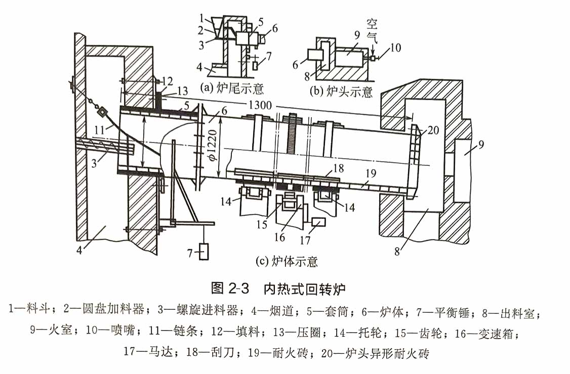 回转炉为卧式,筒体用钢板制成,为防止物料与钢板直接接触,同时避免影响产品质量和腐蚀设备,内衬耐火砖。在中部外套大齿轮,借以推动筒体转动。两端各有一对托轮,支承筒体质量。炉头和炉尾均有密封装置,以防止气体外逸.污染操作环境。安装时须保持一定的倾斜度(一般为2°~5°).使物料能从炉尾向炉头移动。