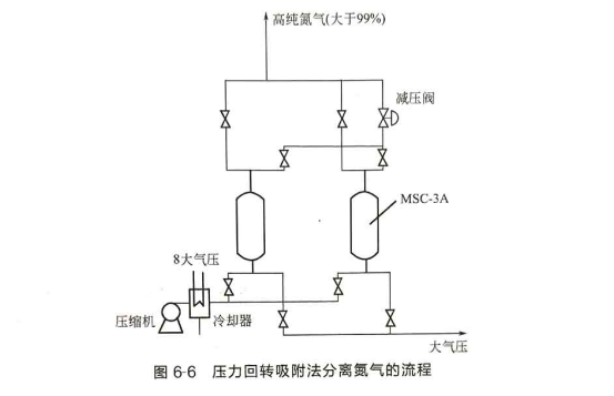 氮气的压力回转吸附是从原料空气中吸附除去氧气、二氧化碳及水分而获得氮气产品的分离过程,常使用分子筛活性炭。该法是利用不同气体向分子筛活性炭的吸附速度差异进行分离的,工艺流程见图6-6。在相同的压力下,氮气、氩气、氧气的平衡吸附量差别并不大,但与分子筛活性炭的吸附速度相差40倍左右。因此,通过采用适当的吸附时间的方法,便能进行高度分离。现在,在压力回转吸附装置中,吸附时间为1~2min的场合,使用吸附速度大的和短周期型分子活性炭有利,在重视得率的场合,使用吸附小的长周期型分子筛活性炭有利。此外,吸附速度及平衡吸附量都受温度的影响较大,可以分别在寒冷地区使用前一种分子筛活性炭,在温暖的地方使用后一种分子筛。