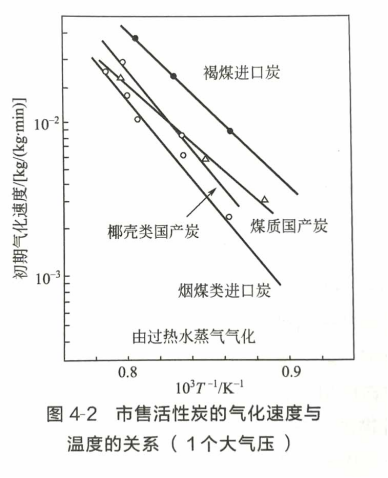 在活化过程中,需要利用碳化过程中所生成的固定碳与活性炭本身的气化反应速率的差异,有选择的使固定碳气化。图4-2为4种市售活性炭用过热水蒸气(1atm,即101.3kPa)活化时的气化速度。另外,需要严格控制活化过程的最终温度和停留时间,使活性炭的损失在5%-10%。例如对水处理用煤质活性炭用900℃的过热水蒸气活化再生时,为了使活性炭的损失低于5%,必须把滞留时间控制在8min以内。此外,为减少活性炭的物理性消耗及粉化,要注意选择合理的气流速度并控制好活性炭的装卸运输环节。