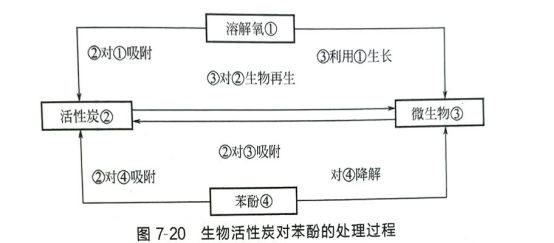 生物活性炭法处理苯酚的过程,包括活性炭、微生物、水中的苯酚及溶解氧4个因素及其在水中的相互作用。图7-20所示为生物活性炭法的相互作用关系