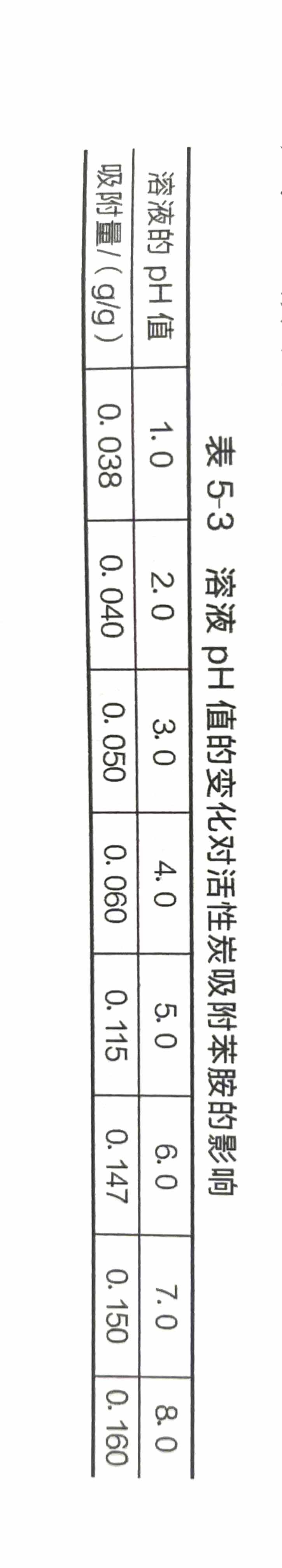 PH值对活性炭液相吸附有着显著的影响,尤其是用于色素吸附。由于天然色素很多都是酸性色素,也有少量碱性色素,所以通过选择合适的PH值可以增加活性炭对色素的吸附性能。活性炭对一些物质的吸附均随介质PH值的变化而变化,包括水溶液和非水溶液。以下是PH值的变化对脱色性能的影响。当平衡浓度为0.1g/L时每克活性炭吸附苯胺量随溶液PH值变化的情况如表5-3所示。