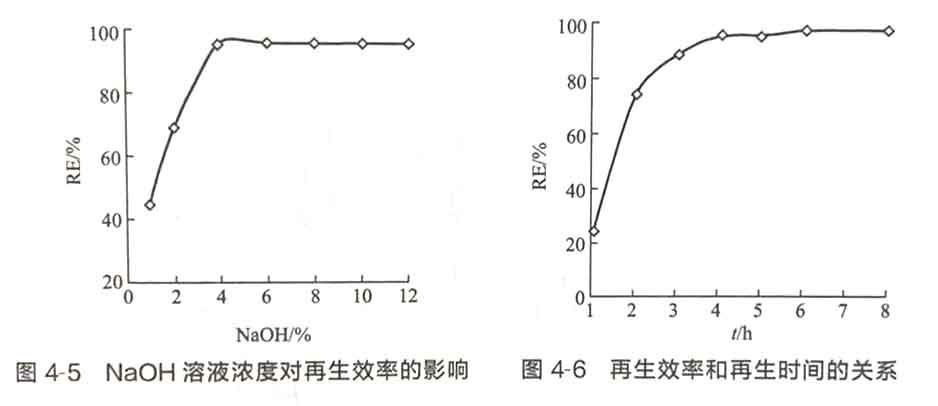用碱处理吸附饱和活性炭的另一个例子是吸附柠檬酸发酵液达饱和的活性炭的再生。当色素在水里形成离子型溶物时,即说明活性炭吸附已达饱和,可开始对活性炭进行再生处理。图4-5、图4-6是使用NaOH液对饱和柠檬酸炭的再生过程中碱液浓度和再生时间对再生效率的影响。